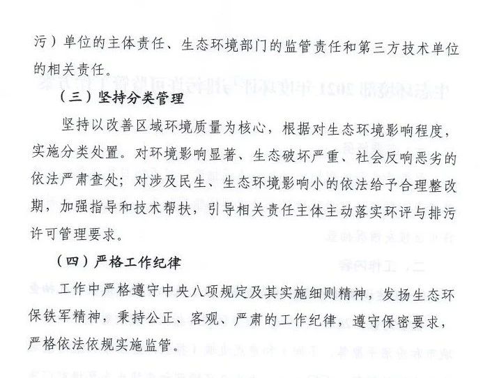 《行动计划》指出,各级生态环境部门在监管工作中应坚持以改善区域环境质量为核心,随机监管和靶向监管相结合,根据对生态环境影响程度,实施分类处置。环评与排污许可管理部门和生态环境综合执法部门应协调联动,推进审查审批与行政执法衔接,形成监管合力。